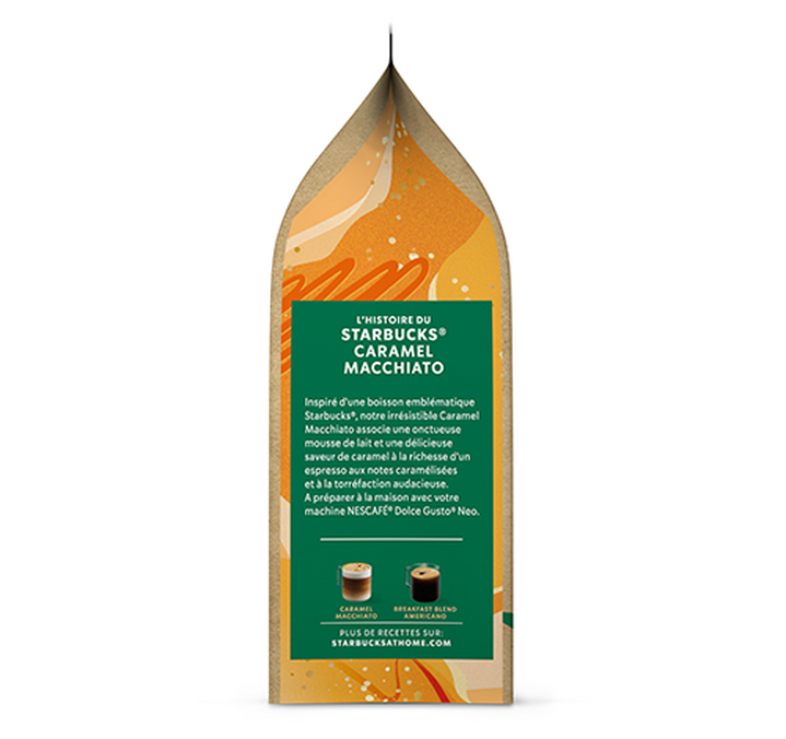 Bring one of the most emblematic Starbucks drinks home! No need to go out to enjoy a Caramel Macchiato. Simply press the button on your Neo machine to enjoy the delicious caramel flavour in your boldly roasted espresso. A creamy milk foam enhances every sip. The pod contains your dose of coffee, and the sachet your dose of powdered milk. Other Starbucks products are available in the Nescafé® Dolce Gusto® pods range, so treat yourself!
