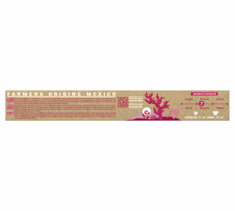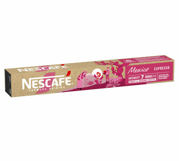 Discover Nescafé Farmers Origins Mexico coffee, available in a pack of 10 Nespresso* Original-compatible coffee capsules! With your Nespresso* Original machine, enjoy a 40 ml espresso that is smooth, balanced and full-bodied thanks to its medium roast. This blend of hand-picked Arabica and Robusta beans reveals subtle cereal notes. The capsules are made of aluminium, compatible with Nespresso* Original and fully recyclable. Box of 10 capsules.