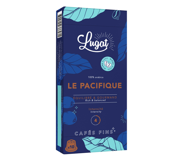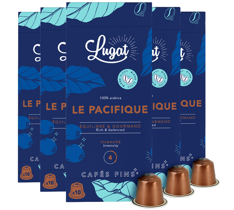 Blend du Pacifique Nespresso* Original pods by Lugat: a blend of Arabica from Guatemala, Costa Rica and Colombia. For a smooth and gourmet coffee with notes of nutty chocolate spread, almonds & cocoa. Box of 50 coffee pods. Capsules compatible with Nespresso* Original machines.