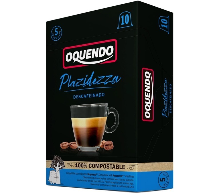 Oquendo Placidezza biodegradable capsules for Nespresso: A blend of Arabica & Robusta. Decaffeinated coffee. For a caffeine-free espresso with a good crema. 100% compostable coffee pods. 1 box of 10 capsules.
