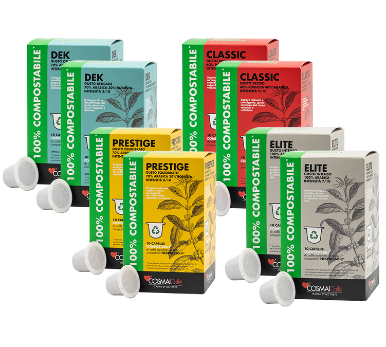 Pack of 80 Nespresso capsules from Cosmai Caffe, compatible with Nespresso 4 different coffees: Decaffeinated, Prestige, Elite and Classic. Roasted in Italy.