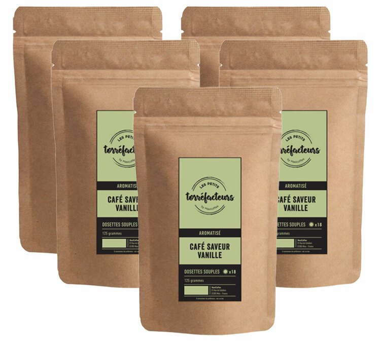 Enjoy this vanilla flavoured coffee with soft pods compatible with Senseo machines and manual espresso machines that accept soft pods. Artificially flavoured. Packaging: 5 packets of 18 non-overwrapped soft pods in a kraft paper bag.