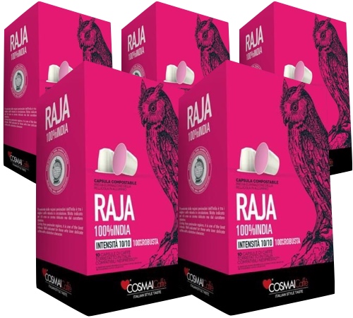Capsules compatible with Nespresso* Original machines. Cosmai Caffè Raja Indian coffee: 100% Robusta from India for a very strong espresso with spicy notes and a beautiful crema. Made for coffee lovers looking for a big kick in a cup! 5 boxes of 10 Nespresso* Original compatible pods.