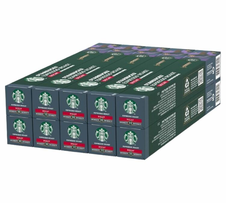 Starbucks by Nespresso* Original Decaf Espresso Roast: a dark American roast for a very strong espresso without caffeine. Notes of caramel. 10 boxes of 10 Nespresso* Original pods.