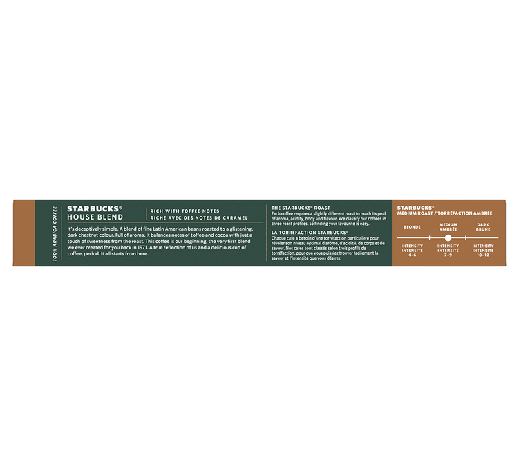 Starbucks by Nespresso* Original House Blend: the first blend made by Starbucks in a capsule. For a balanced coffee with good acidity and light body. Ideal after a meal with a dark chocolate square! 1 box of 10 coffee pods.