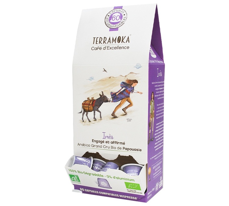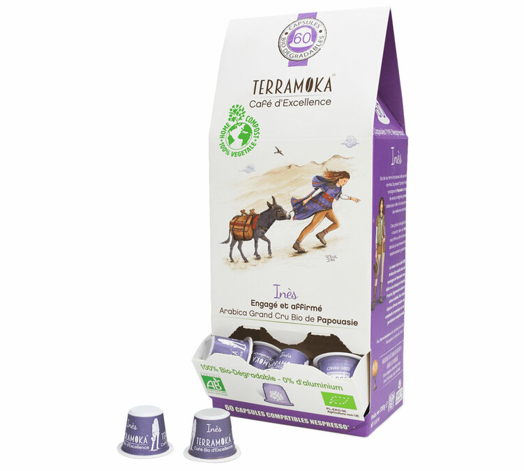 'Inès' from TerraMoka is an organic pure origin Arabica from Papua New Guinea. For a balanced, aromatic coffee with spicy notes. 1 dispensing box of 60 biodegradable Nespresso® compatible capsules.