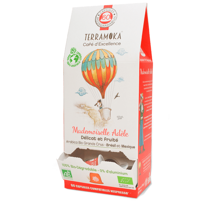 'Mademoiselle Adèle' by TerraMoka is a perfect blend of organic arabica coffees from Brazil and Mexico. For a strong coffee with a beautiful dense cream and roasted, grassy notes. 1 box of 15 biodegradable Nespresso* Original compatible capsules. Capsules compatible with Nespresso* Original machines