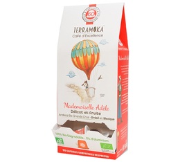 'Mademoiselle Adèle' by TerraMoka is a perfect blend of organic arabica coffees from Brazil and Mexico. For a strong coffee with a beautiful dense cream and roasted, grassy notes. 1 dispensing box of 60 biodegradable Nespresso* Original compatible capsules.