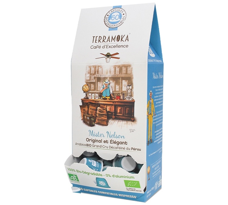 'Mister Nelson' capsules by TerraMoka: an organic decaffeinated coffee from Peru. 100% Arabica. For a fine balanced coffee with fruity notes. Decaffeinated with water. 1 dispensing box of 60 biodegradable Nespresso* Original-compatible capsules.