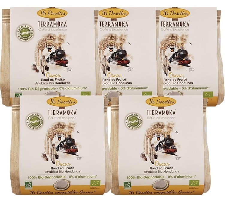 TerraMoka 'Oscar' coffee pods for Senseo: 100% Organic Arabica from Honduras. For a strong aromatic coffee. Compostable packaging. Biodegradable pods. 5 packs of 16 Senseo-compatible coffee pods.
