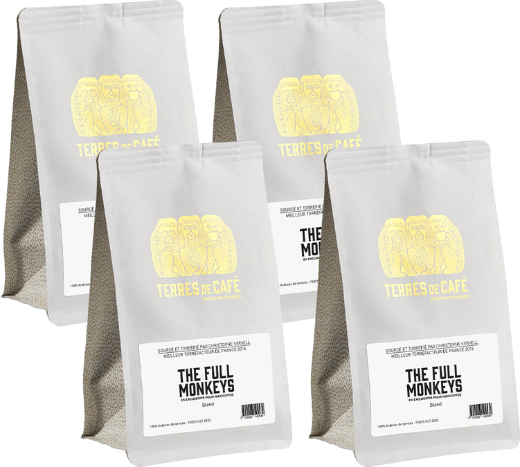 Terres de Café 'The Full Monkeys' coffee beans: an exclusive blend created for MaxiCoffee with Christophe Servell, French 2015 Best Coffee Roaster. A blend of 3 Arabicas, picked and roasted to deliver a balanced, aromatic cup of coffee. 4x250g coffee beans.