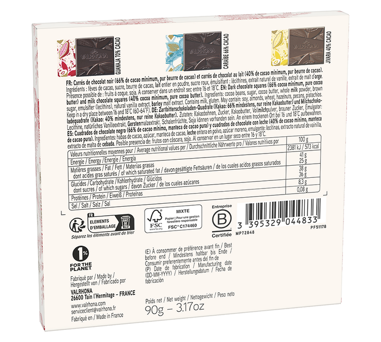 This box contains dark chocolate squares (minimum 66% cocoa, pure cocoa butter) and milk chocolate squares (minimum 40% cocoa, pure cocoa butter). It’s the perfect Christmas Chocolate box to bring out with coffee. This Valrhona gift set is a limited edition in its 2025 design.