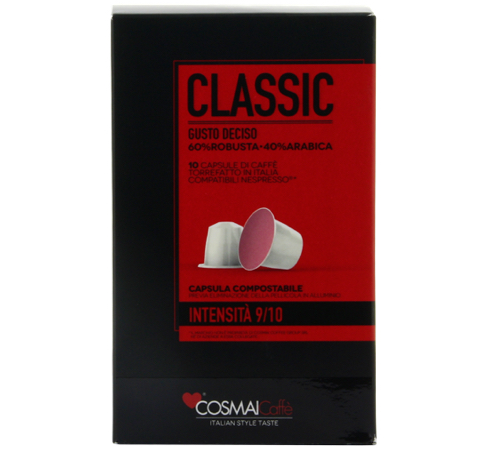 These Classic capsules come from Cosmai Caffè brand. 1 box contains 10 capsules. For a strong coffee with notes of cocoa. Nespresso-compatible capsules.  Arabica & Robusta blend, roasted in Italy.