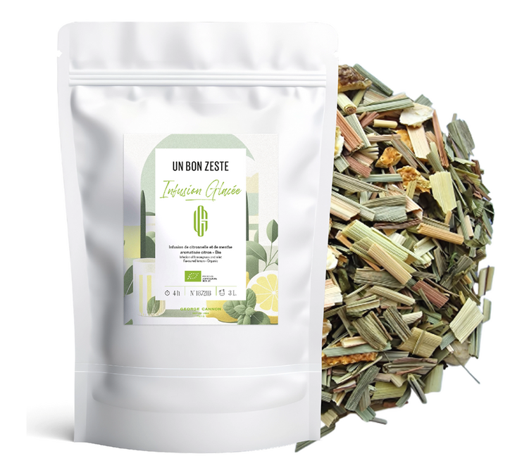 This iced infusion, "Un bon zeste" by George Cannon, will be a must-have for all lemongrass aficionados. Very present on the palate, it is softened by a hint of cane sugar and fennel. Lemon peel adds even more freshness to the palate, for a wonderful result.