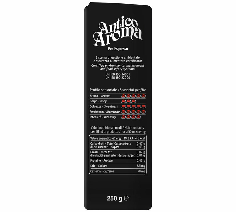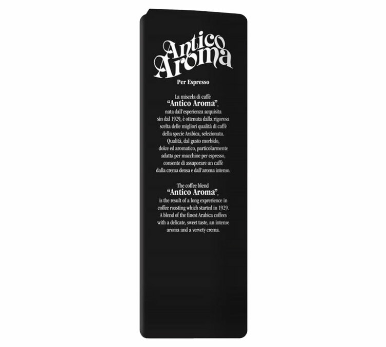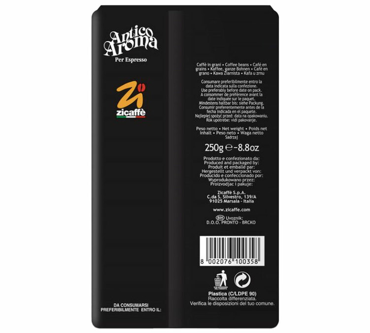 'Antico Aroma' by Zicaffè is a blend of Arabica and Robusta, delivering a really intense, very strong coffee with gourmet notes. Roasted in Italy. Best enjoyed as an espresso. 250g coffee beans.