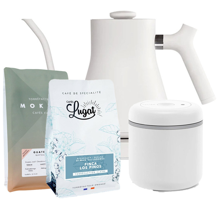Découvrez les arômes du Slow coffee avec ce pack regroupant une bouilloire à col de cygne, une boite de conservation et deux cafés. Cette belle bouilloire électrique à température réglable Stagg EKG d'une contenance de 90 cl de la marque Fellow, elle vous assistera dans la réalisation de votre boisson. Vous pourrez conserver votre café dans une boite vide d'air.
