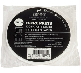 Lot de 100 filtres papiers pour cafetière à piston Espro P7 50cl vous permettant d'obtenir un résultat plus clean (moins de sédiment et d'amertume) de votre café ou thé.