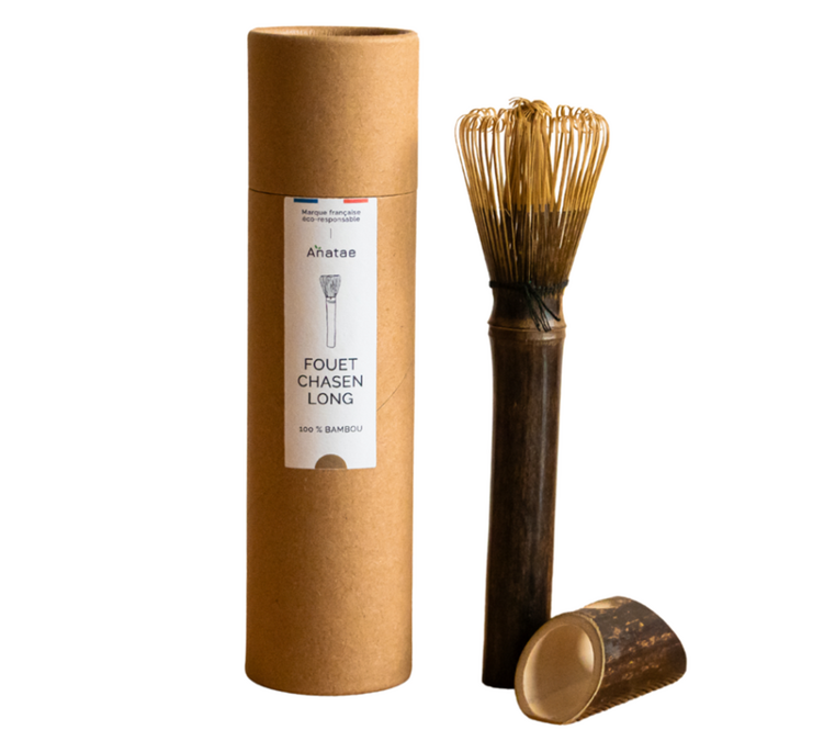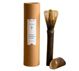 Ce chasen est plus long et plus étroit qu'un chasen traditionnel. Les fouets à matcha traditionnels font généralement 5.5 cm de diamètre, celui-ci en fait 4 (du côté des brins). Il fait 15 cm de long ce qui assure une bonne prise en main pour réaliser des matchas dans un verre ou une tasse haute, alors qu'un chasen traditionnel est pensé pour être utilisé avec un bol à matcha (vous pouvez en retrouver dans notre catalogue dédié au matcha).
