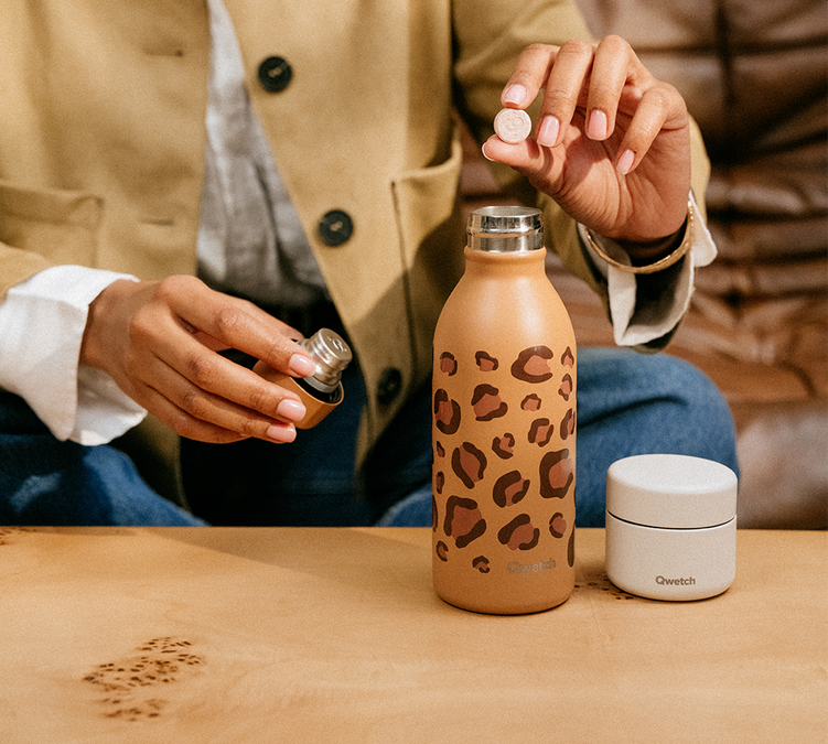 Alliez style et praticité avec cette gourde isotherme Qwetch au design camel léopard. Conçue en acier inoxydable de haute qualité, elle vous accompagne partout au quotidien.