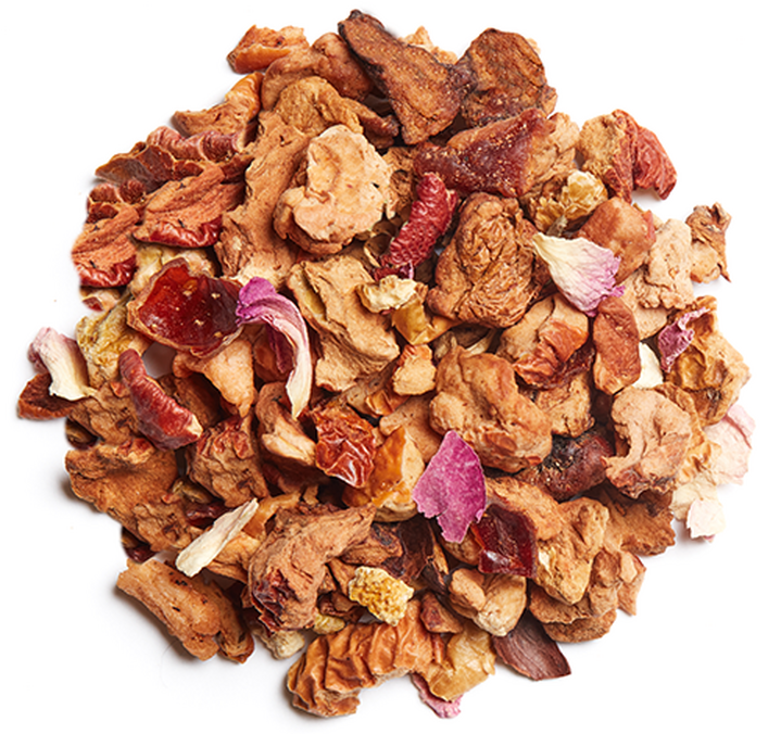 Ingrédients : pomme*, rooibos* (Afrique du Sud), caroube* (8%), huile essentielle d'orange* (2%), arôme naturel de vanille Bourbon (2%), écorces d'orange* (1%), coques de fèves de cacao*, pétales de rose*, cynorrhodon*.