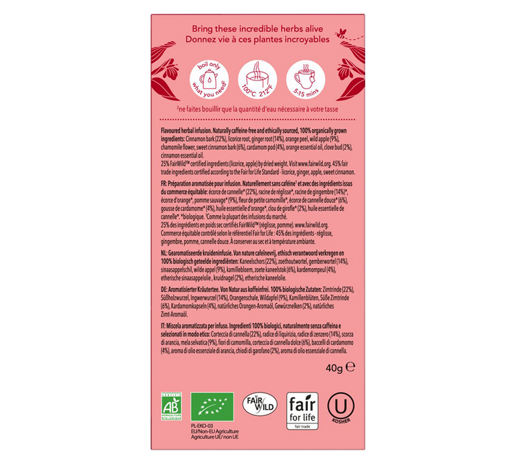 Ingrédients :  écorce de cannelle (22%), racine de réglisse, racine de gingembre, écorce d’orange (14%), pomme sauvage (9%), fleur de camomille, écorce de cannelle sucrée (6%), graine de cardamome, huile essentielle d’orange (4%), clou de girofle, huile essentielle de cannelle (1%). Tous les ingrédients sont issus de l'Agriculture Biologique.