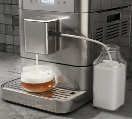 L’expresso broyeur KitchenAid 5KES8556 a un style sobre et élégant, équipé d’un écran de 2.4 pouces qui permet d’accéder aux différents paramètres de la machine. Une barre led sur la buse café s’allume lors de la préparation des boissons. Cette machine est équipée de grands contenants adaptés à une utilisation familiale.