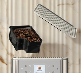 Le couvercle est équipé d’un joint d’étanchéité qui protège les grains de café de l’oxydation. Le bac d’égouttage se tire vers l’avant pour donner accès au bac à marc. La buse café adaptable en hauteur permet de positionner des tasses jusqu’à 13 cm.