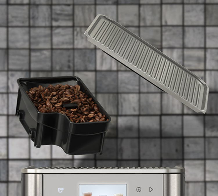 Avec ses prestations haut de gamme, on retrouve forcément un joint d'étanchéité sous le couvercle du bac à grain, il protège les grains de café de l'oxydation, mais aussi permet une meilleure isolation du bruit lors de l'extraction. Sous le couvercle du bac à grain est aussi disponible la trappe à moulu pratique pour préparer un décaféiné.