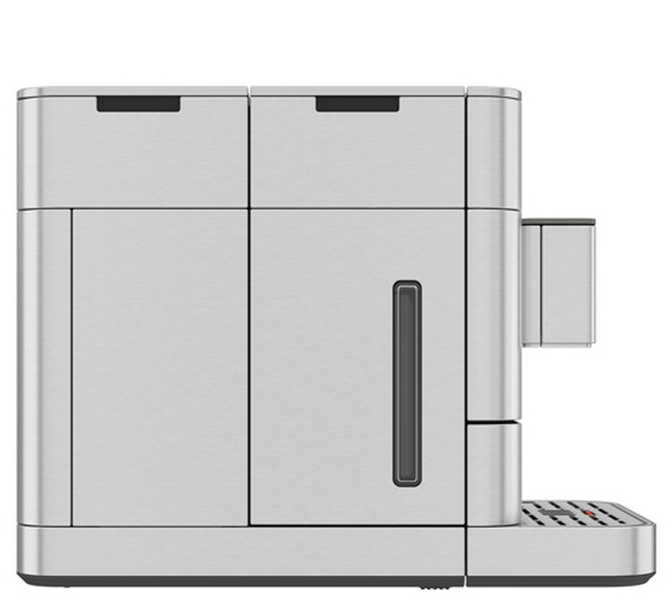 Sur la gamme KF8, ce qui impressionne en premier est son grand écran. La fluidité de la navigation, les différents paramètres disponible pour chaque boisson, on retrouve des finitions premium. Le design et corps de la machine sont aussi remarquables avec des prestations haut de gamme. On retrouve un corps en acier inoxydable, la marque délicatement inscrite sur le repose tasse, le tout avec du goût. Le dessus de la machine est en ABS avec l'accès aux différents contenants. L'expresso broyeur correspond à une utilisation familiale, ses contenants sont immenses :