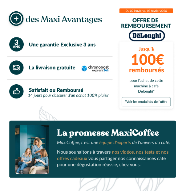 La DeLonghi Rivelia a reçu le label LONGTIME qui atteste de la durabilité de sa conception, de la qualité des matériaux, de sa réparabilité et de l’efficacité du service après-vente de la marque. En choisissant MaxiCoffee, vous bénéficiez automatiquement d’une extension de garantie à trois ans pour une expérience d’achat en toute sérénité
