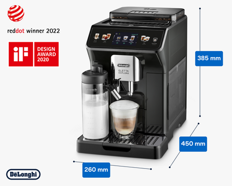 La cafetière à grain DeLonghi Eletta Explore est un véritable bijou sous tous les angles. Son design moderne et soigné, associé à sa couleur gris anthracite et ses buses en acier inoxydable, lui confère un aspect très élégant. Pour compléter le tout, cette machine à café DeLonghi est équipée d'un repose-tasse en acier inoxydable avec un système anti-rayures.