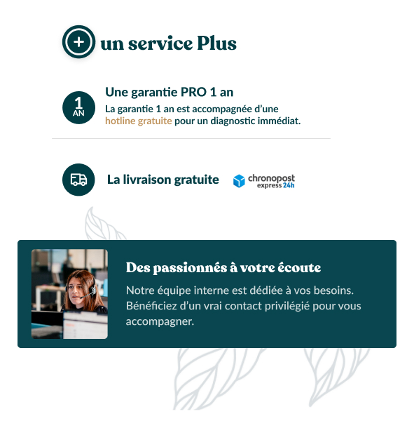 • Un SAV professionnels : Livraison Chronopost, Hotline gratuite...
