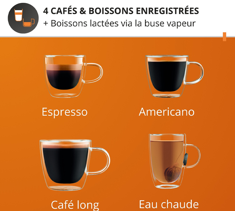 Accédez d'un simple geste à vos boissons préférées : expresso, lungo, americano ou eau chaude pour le thé sont disponibles par simple pression d'un bouton.