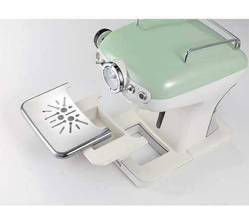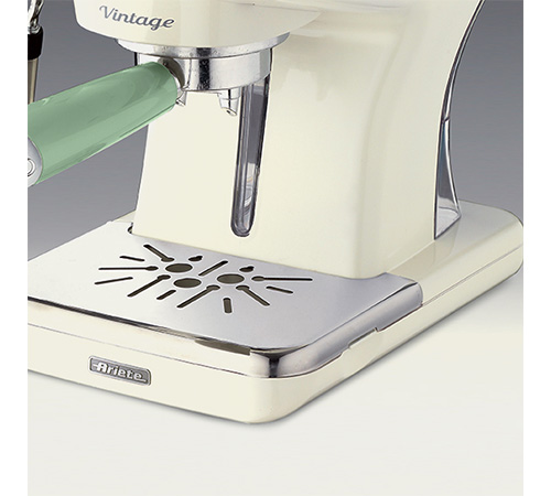 La machine expresso Ariete Espresso Vintage 1389 Verte porte vraiment bien son nom avec son design rétro, tout en ABS, de couleur vert pâle et son charme dans le style des boutons type aviation.