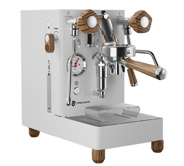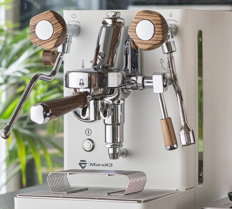 La LELIT MaraX3 affiche un design affirmé, à la fois compact et résolument premium. Son châssis en acier inoxydable s’associe à des finitions en bois zebrano pour un rendu chaleureux et contemporain. Elle permet d’ajuster finement vos paramètres d’extraction et est également équipée du porte-filtre « Coffee Slide », signature de Lelit.