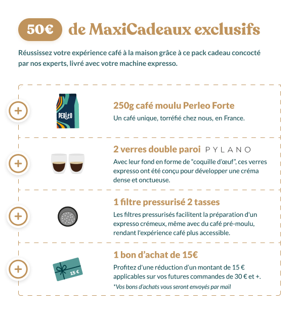 De plus, MaxiCoffee vous offre un filtre pressurisé deux tasses pour pouvoir utiliser du café pré-moulu.