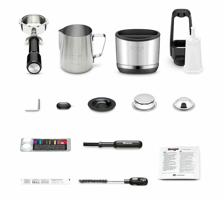 La machine expresso SAGE Oracle Jet est livrée avec de nombreux accessoires barista : porte-filtre en acier inoxydable de 58 mm, Knock Box™ 10, filtre simple 1 et 2 tasses, brosse de sortie de mouture et aimant de retrait du dameur, brosse de nettoyage, outil de nettoyage pour l'embout de la buse à vapeur, clé Allen, disque de nettoyage, pastilles de nettoyage, bandelette de test de dureté de l'eau, filtre à eau et support de filtre, poudre de détartrage.
