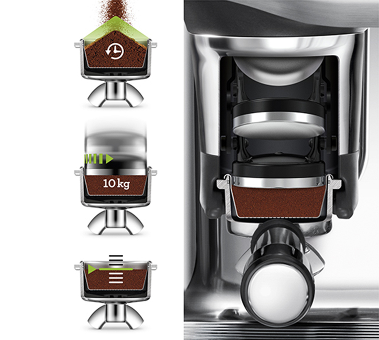 La SAGE Barista Touch Impress ne se contente pas de juste tasser le café. En effet, le système Impress Puck copie le geste du barista avec une pression de 10 kg et une torsion professionnelle de 7° sur la galette de café moulu.
