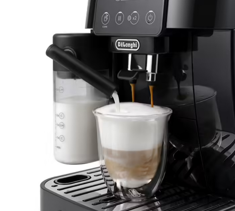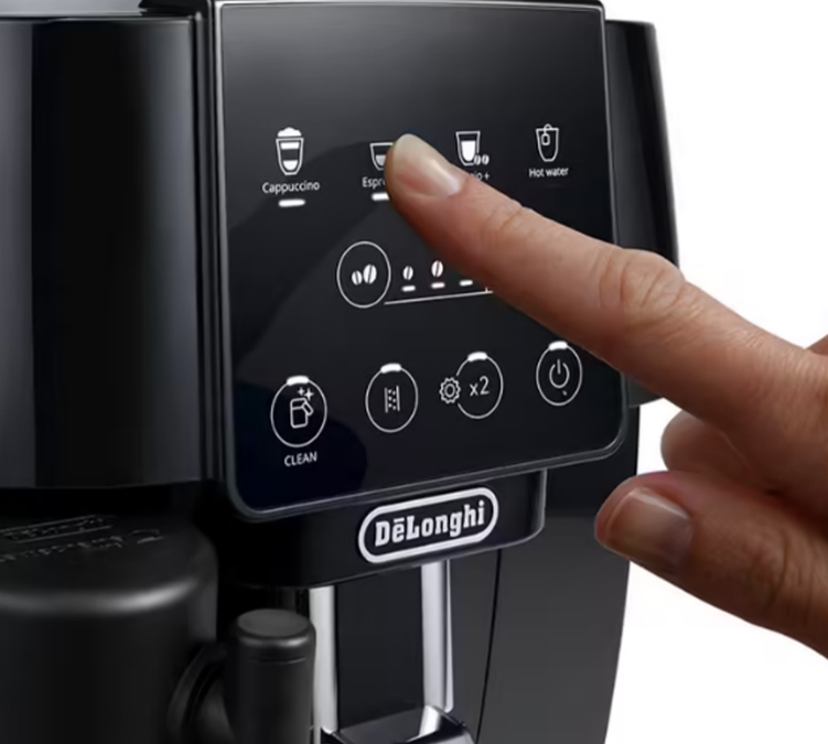La Gamme de machines à café à grain DeLonghi Magnifica se réinvente avec les Magnifica START. Sa carrosserie est en ABS noire s'intègre parfaitement à la partie tactile, noire aussi et brillante.