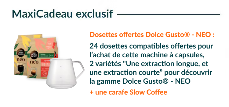 Pour que vous puissiez déguster un café d'extraction rapide et un café d'extraction lente dès la réception de votre colis, nous avons préparé une offre-cadeau exclusive. Vous trouverez dans votre colis un paquet de 12 dosettes Espresso ainsi qu'un paquet de 12 dosettes Grande (extraction lente pour pouvoir être utilisées avec votre carafe Kinto). D'autres dosettes Nescafé® Dolce Gusto® vous attendent sur Maxicoffee.com !