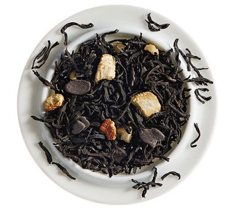 Vous trouverez aussi dans ce thé de véritables pépites de chocolat noir, des morceaux d'amande et des écorces d'orange.