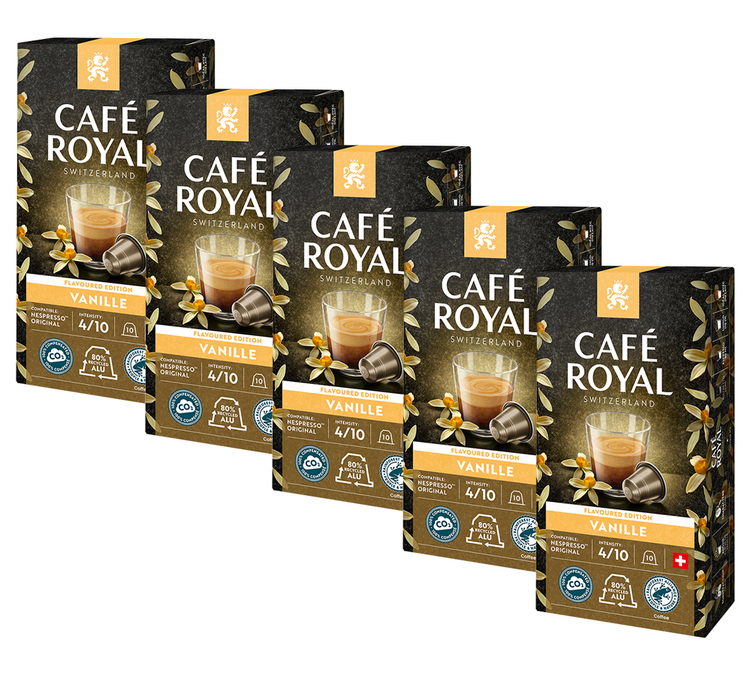 Discover these Café Royal Café Vanilia capsules compatible with all Nespresso® machines. These flavoured Nespresso® compatible pods will give you a delicate vanilla flavour that blends with the aromas of roasting. Aluminium capsules to preserve flavour and freshness. Packaging: 5 boxes of 10 capsules.