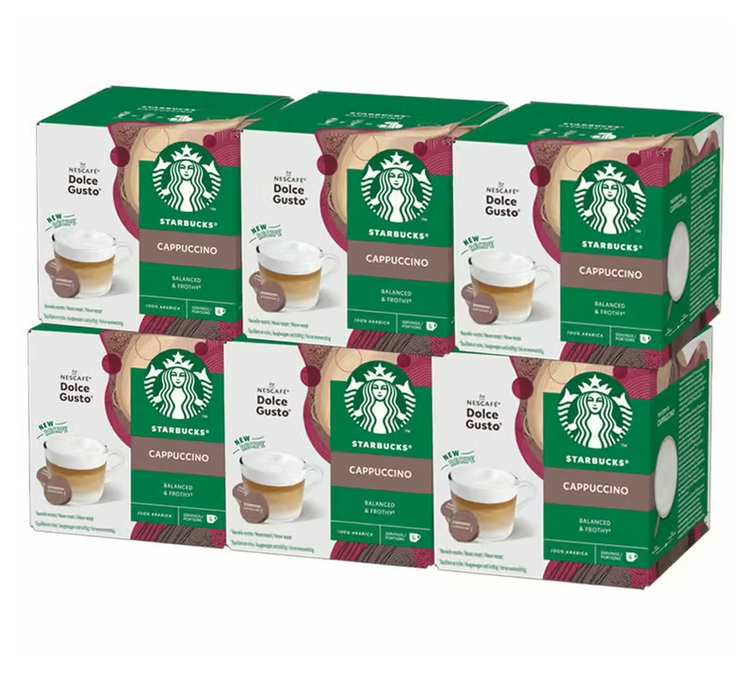 Envie de goûter les excellentes boissons lactées de la marque américaine Starbucks ? C'est désormais possible à la maison grâce à ces capsules Cappuccino compatibles avec votre machine Nescafé* Dolce Gusto*. Vous allez succomber à la puissance aromatique du café associée à l'onctuosité de la mousse de lait. Conditionnement : 6 boîtes de 12 capsules.