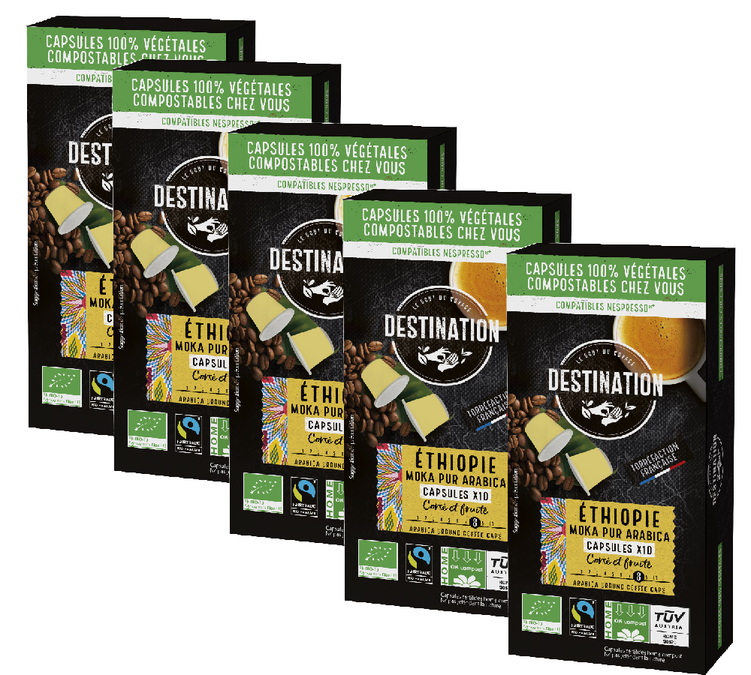 Dégustez un excellent expresso 100% Moka d'Ethiopie aux notes fruitées et à l'intensité marquée. Destination vous propose un café issu de l'agriculture biologique. Ces capsules sont conçues à base de fibre de bois biodégradables et compostables, garanties sans OGM et sans aluminium. Conditionnement : 5 boîtes de 10 capsules compatibles Nespresso* Original.