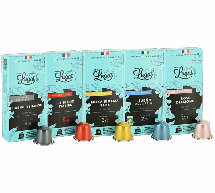 Découvrez nos incontournables Lugat en capsules compatibles Nespresso* Original. Dégustez cinq cafés différents, doux ou corsé, avec des notes de dégustation variées, torréfiés en France par nos torréfacteurs. Chaque café est conditionné dans une capsule en aluminium pour préserver ses qualités gustatives. Et le petit plus : ces capsules sont 100% recyclables. Ce pack (parfait à offrir ou à s'offrir) contient 5 boîtes de 10 capsules chacune.