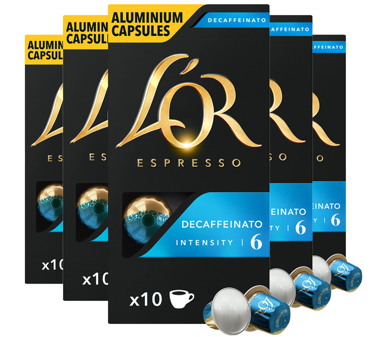 Capsules compatibles avec les machines Nespresso* Original. Découvrez les capsules L'Or Espresso Décaféinato pour machines à capsules compatibles Nespresso* Original. Ces capsules de café décaféiné libèrent un expresso riche et élégant, avec une pointe de cacao et de baies sauvages. Capsules compatibles Nespresso* Original. Conditionnement : 5 boîtes de 10 capsules.