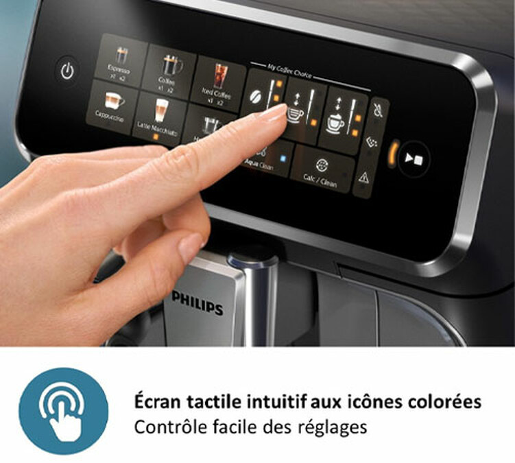 La finesse de votre café sera réglable sur 12 niveaux de moutures différentes. Vous aurez également le choix de l'intensité et la longueur de tasse sur 3 niveaux pour toutes les boissons café. Ces paramètres sont très simples à sélectionner depuis le grand pavé de réglages de la machine EP3349/70 : ses touches sont tactiles et intuitives avec des pictogrammes. Il y a par ailleurs des petites diodes qui clignotent sur ce pavé tactile, pour attirer l'attention de l'utilisateur : lorsqu'il n'y a plus d'eau par exemple.