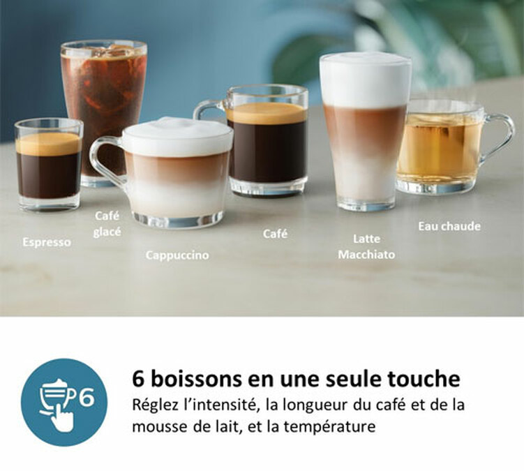 Sur cette machine expresso broyeur, vous pourrez réaliser plusieurs boissons: des boissons cafés classiques (expresso, café noir), lactées (cappuccino, macchiato), et aussi des boissons froides (café glacé). De plus, la machine est équipée de la technologie Silent Brew qui réalisera toutes les extractions avec moins de bruit.