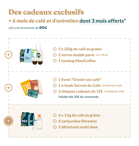 Économisez plus de 60€ avec le pack 6 mois de café et 6 mois de produit d'entretien dont 3 mois offerts, vous aurez juste à profiter de votre machine et de ses nombreuses boissons.
