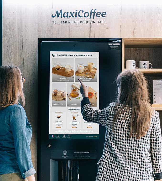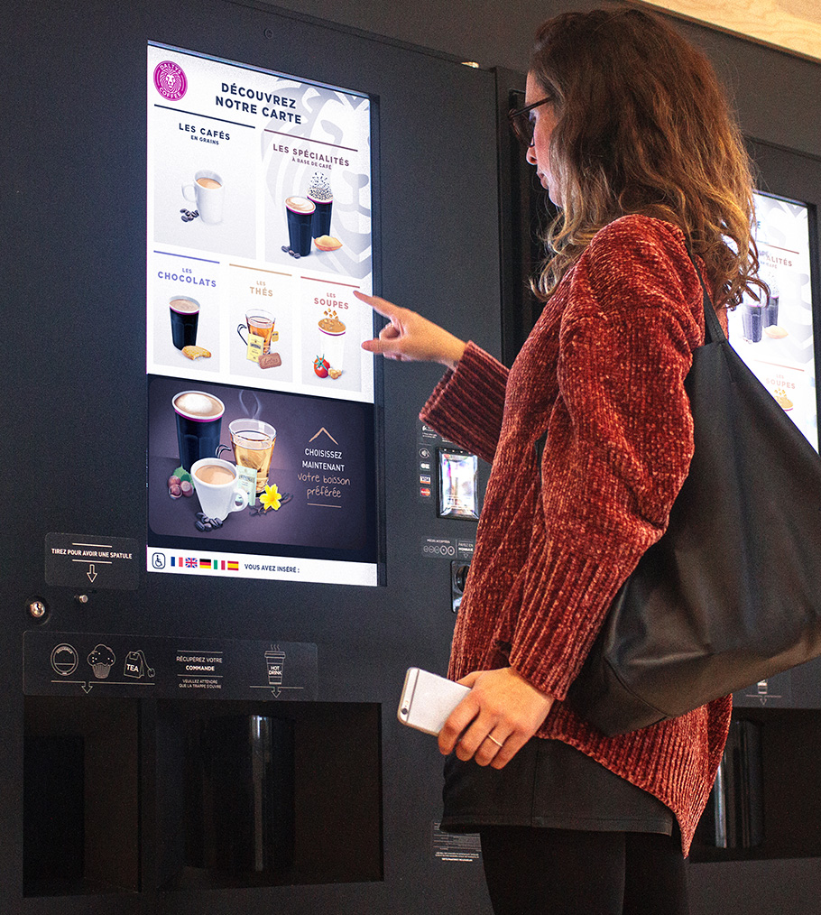 Un distributeur de boissons chaudes à écran tactile avec toutes les dernières technologies embarquées (lecteur CB sans contact, machine connectée à distance, impression de reçu...).